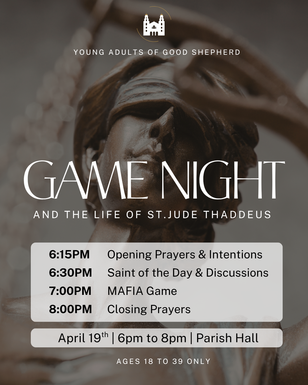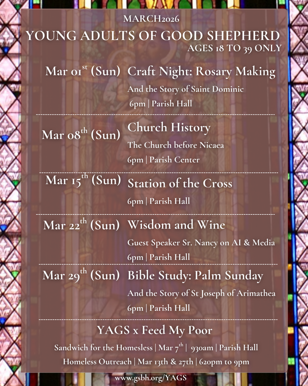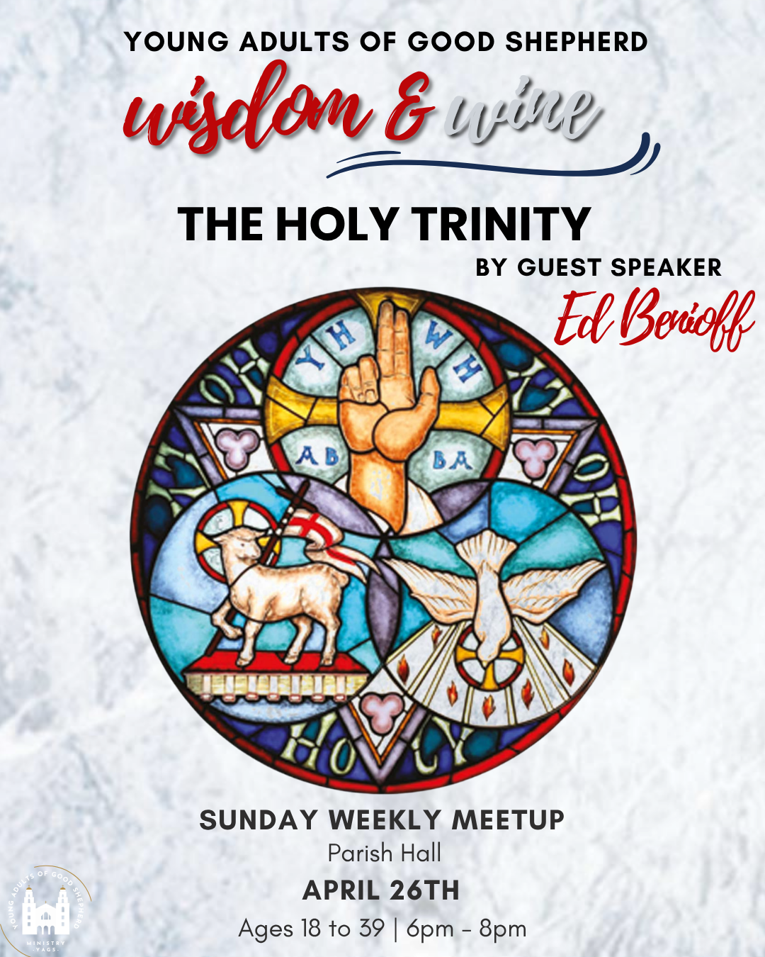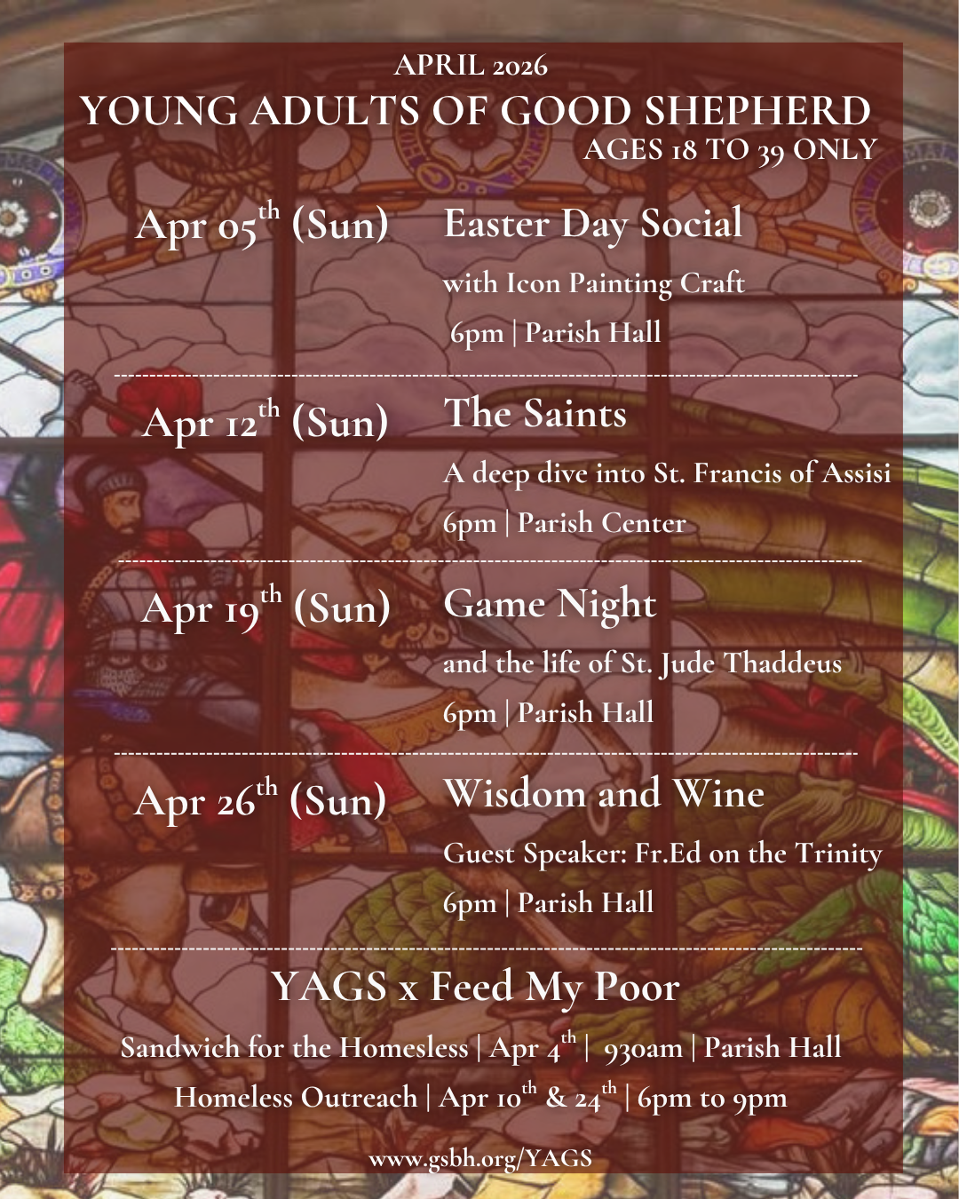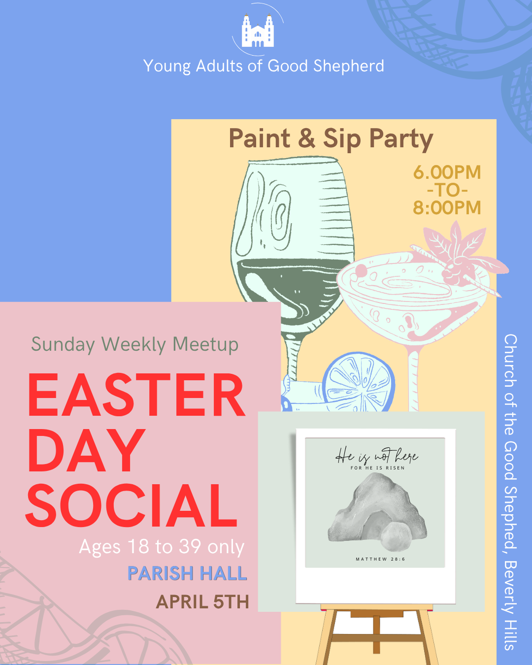 We focus on building authentic friendships, sharing our Catholic faith, and serving those in need. The Young Adults of Good Shepherd Ministry (YAGS) is a Catholic fellowship for adults ages 18 to 39, both married or single, serving Beverly Hills and the neighboring communities.